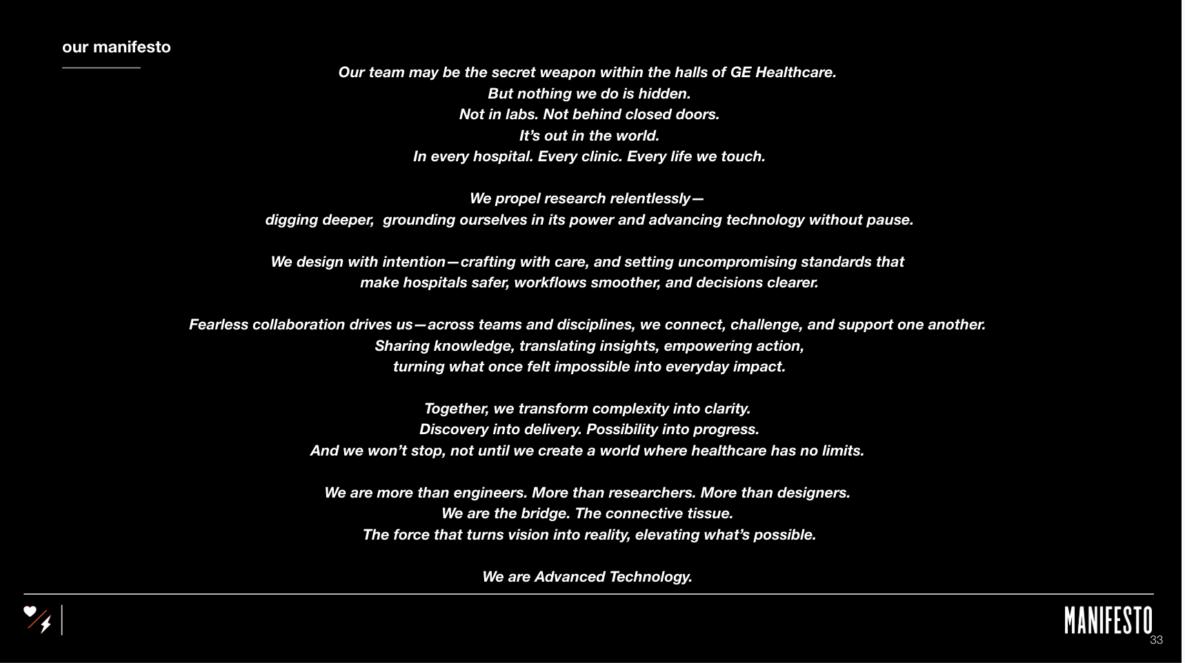 We partnered with GE HealthCare to define and elevate Advanced Technologies as a visible, unified force within the organization. The work centered on articulating a clear narrative for a complex, cross-functional group—bringing together disparate teams under a single identity while capturing the ambition and impact of their work.